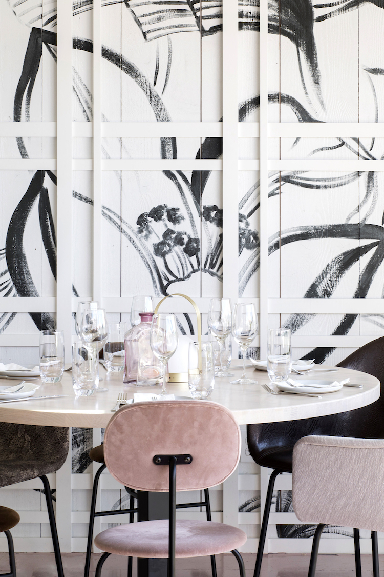 The mural encompasses the entire main dining room of Sel Rrose Montauk. The painted aspect traverses all four walls and reaches nearly 18 ’at its highest point, and the design meanders above and below the banquettes, and around the existing architectural elements in the space. The scale of the painted portion is oversized, and the plaid lattice overlays from floor to ceiling, wall to wall. The inspiration began with Dorothy Draper, and her use of scale as well as classic design elements synonymous with decorating in the Hamptons, like trellised walls and floral patterns, just to name two. We took these elements and reinterpreted them so that they would feel new and also in line with Sel Rrose’s existing brand identity on the Lower East Side. We morphed that into what Sel Rrose could become in Montauk. The mural was hand-painted by Candice Kaye, using Benjamin Moore paint. – Design Director Dane Pressner