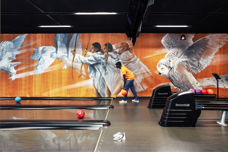 The mural is located in the bowling alley of Denizen Bushwick (a luxury rental complex in Brooklyn). We started the nonprofit organization OPEN (ODA’s Public Engagement in Neighborhoods) in 2017 with the purpose of giving local non-profits the resources they need to develop projects that unite, engage and empower residents of diverse backgrounds. We engaged OPEN to fill Denizen with murals that engaged the neighborhood, including local artists and community opinions on the artwork. The mural was created by artist Aaron Li-Hill, using a mixture of methods. To obtain the rust effect of the wall, the artist used watered-down acrylic latex paint. When the paint is almost dry, a roller is run back over top which removes paint and creates texture. The figures and animals are all handpainted directly onto the wall. Li-Hill’s inspiration for the mural is of Native American culture and the environment where the building stood, before settlers and colonizers came to New York.
