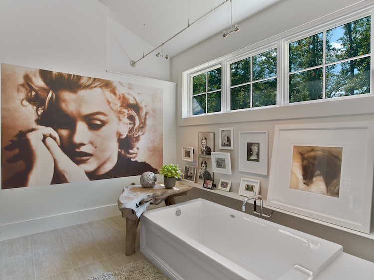 I love Marilyn Monroe – she is the most photogenic person on the planet. This particular image is timeless and my favorite and I love the sepia tones. The mural really makes the space. A huge painting could have also worked, but I like the graphic quality of murals. They are whimsical and have a sense of humor. I’d like to try a cow mural next. This mural is vinyl with a peel-off back, and is installed with a squeegee, similar to putting up wallpaper. – Designer Laura Bohn
