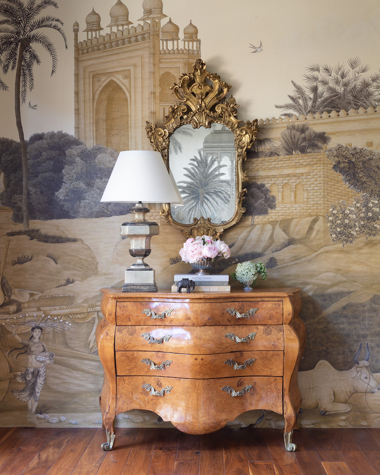 The design is based on archived handpainted panels and decors from Iksel Decorative Arts. The style “Hindustan” is an evocative fantasy landscape of pre-Raj India, imbued with a sense of whimsy and nostalgia. Some of our clients’ favorite scenes feature elephants, tigers, graceful figures and architecture. The Music Room is primarily used for entertainment and the clients wanted to be able to draw visitors into the space. They loved the idea of a scenic wallpaper and natural elements that connect with their beautiful and lush yard, seen through the French doors in the room. The theme of the wallpaper also reflects their Indian heritage and the art found throughout their home. The sepia tone provides the perfect backdrop for the rich, earthy color palette of the furnishings. Though there are many interesting scenes and elements in the mural, it does not read as busy due to the neutral tones. – Heather Hilliard Design
