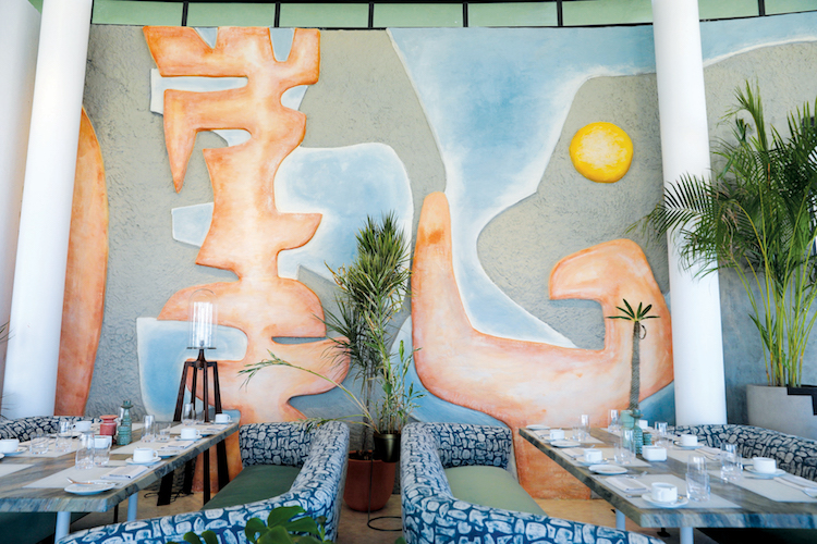 The mural is located in Costa Palmas, inside the restaurant Estiatorio Milos at the Four Seasons. This was an onsite installation where we made the relief out of concrete clay that hardens over the next 24 hours and leaves room for sculpting for about two hours. The shapes and background were applied and sculpted by hand. Once the concrete had cured, we colored the mural with a custom tinted concrete stain. The design inspiration was both the nature surrounding the property as well as the almost brutalist style of Mexican art. In a distant way, the figurative elements in the mural refer to totem poles, the sun, cacti – all elements that can be found in the nature and history of its surroundings. – Katrien Van der Schueren