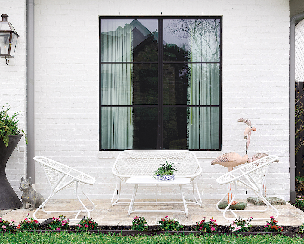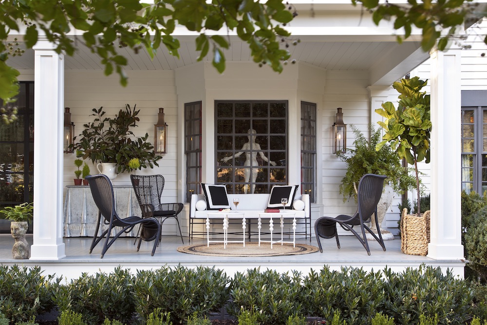 DESIGNER: Mary Patton, Mary Patton Design PROJECT LOCATION: Houston, TX DESIGN DETAILS: This was a new construction home, and the outdoor porch was part of the original plan. The clients love to entertain and wanted to make this a cozy, relaxing spot. For a cohesive look, we incorporated the same color scheme as the interior, which has light floors, black-and-white decor and a warm, darker-toned ceiling. Overall, the design was to feature a neutral palette while having fun and bringing in some whimsy with color. Photo: Molly Culver.