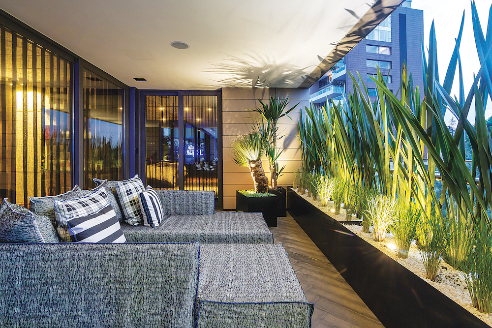 DESIGNER: Olga Hanono PROJECT LOCATION: Mexico City, Mexico DESIGN DETAILS: This terrace is a rectangular shape, so it was a challenge to include both a dining table and a lounge area. But we ended up creating a full outside living room that provides everything the family needs to enjoy wonderful moments together, including a fireplace and a TV area. The interiors are very connected to the exterior, with a bar inside accessible to the outside when hosting large events. The plants add an element of privacy. Photo: Alfonso de Bejar Photography.