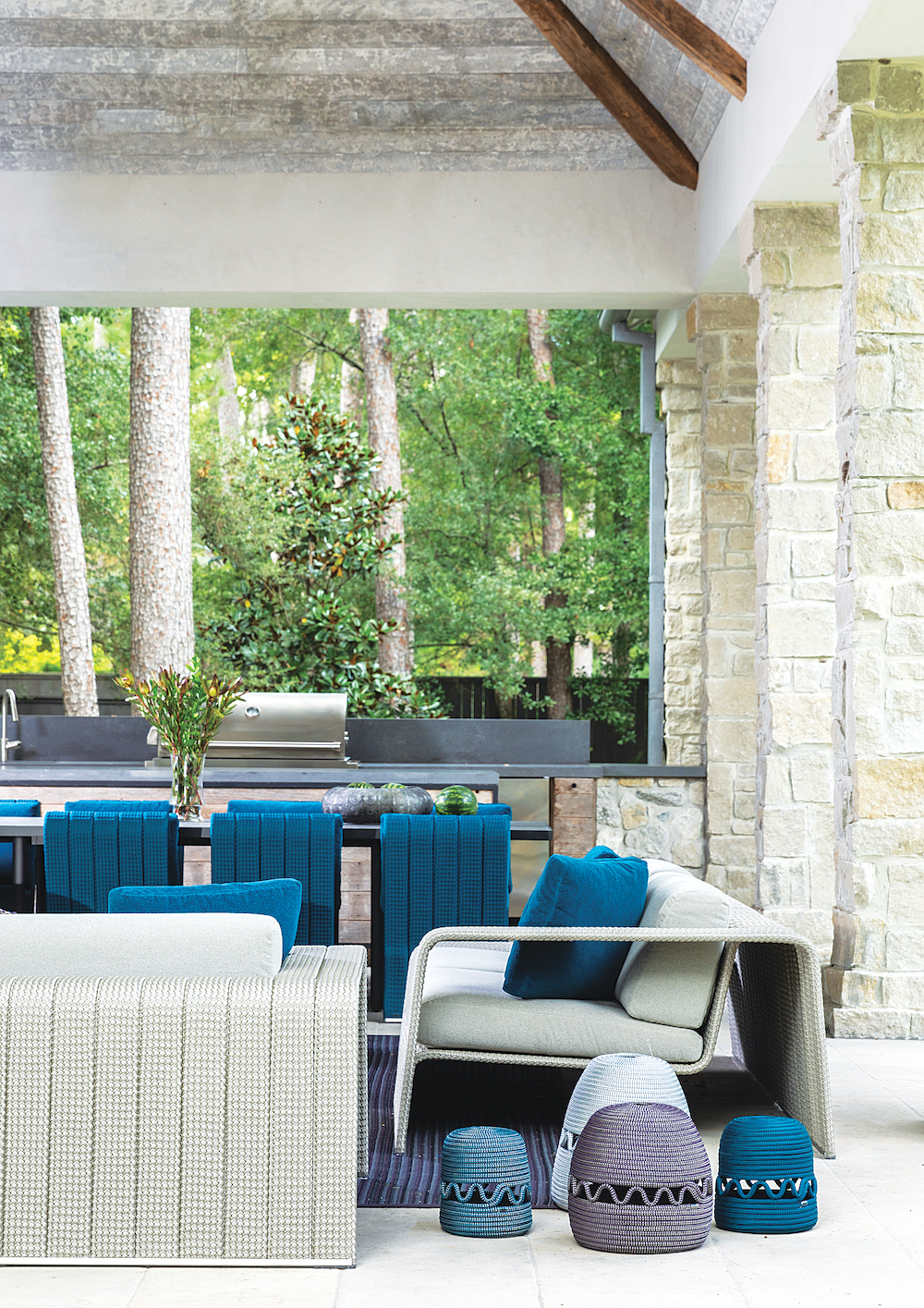 DESIGNER: Nina Magon, Nina Magon Studio PROJECT LOCATION: Houston, TX DESIGN DETAILS: Our client really wanted a versatile outdoor living space that could be used for both entertaining and enjoying time with the family by the pool. Since the space was preexisting, we wanted to elevate it and give it a wow factor by incorporating luxurious Paola Lenti furniture in fabulous blue and purple. We wanted the outdoor space to be exquisite as well as comfortable and functional. Photo: Julie Soefer.