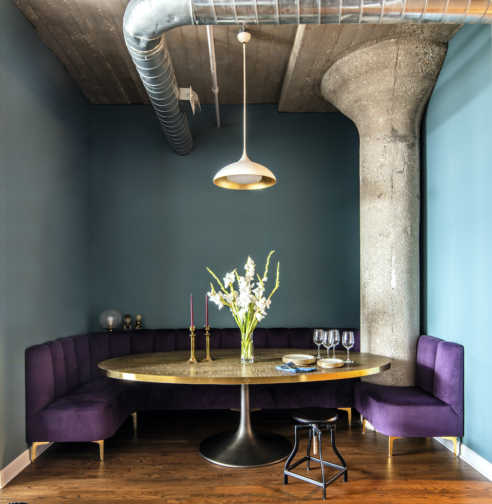 After rendering the majority of her client’s West Loop apartment in a sleek black-and-white palette, Jasmin Reese convinced them to paint the kitchen and dining area in a bold teal hue. “I pushed them out of their comfort zone,” she admits. Indeed, a curvaceous purple velvet channel-tufted banquette wraps around a concrete support column in the dining niche, where a small white pendant casts a pool of light onto the burnt oak tabletop. A compact table lamp and a concealed LED strip that illuminates the back wall add to the moody ambiance. Photo by Nick Johnson