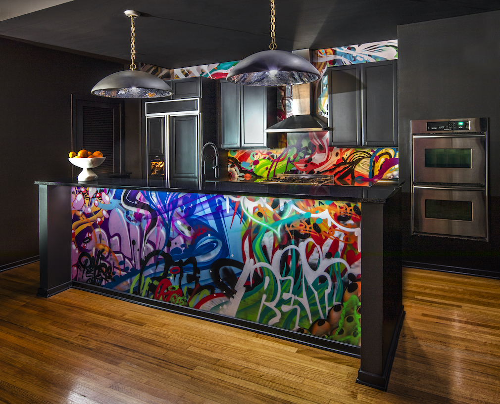 “This place is like a kaleidoscope,” quips interior designer Jasmin Reese of the West Loop kitchen she designed for an eccentric couple who adore color. The designer recruited a local street artist to graffiti the back wall, backsplash and front of the island, using bold primary colors. Embedded with symbols and sayings that reflect the couple, the urban motif pops against the black walls, ceiling and cabinetry. “This place satisfied their love of color. It was really fun to jive with them.” Photo by Nick Johnson