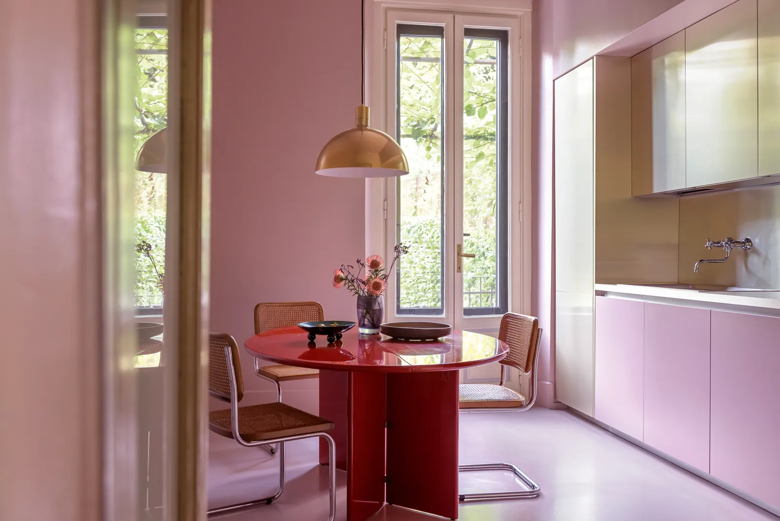 Soft pink walls and matching cabinetry play off the color of the marble floors in this Bergamo, Italy, kitchen by interior designer Daniele Daminelli. “The décor is a blend of ingredients from different eras and styles, mixed with delicacy in search of sophisticated harmony,” he asserts. Indeed, a contemporary brass dome pendant illuminates a deep red lacquered table surrounded by iconic cane-back chairs by Marcel Breuer. Metal cabinets and countertops in a champagne enhance the serene setting. “It’s a quiet space where the client can cook and chat with friends,” he adds. Photo by Nathalie Krag