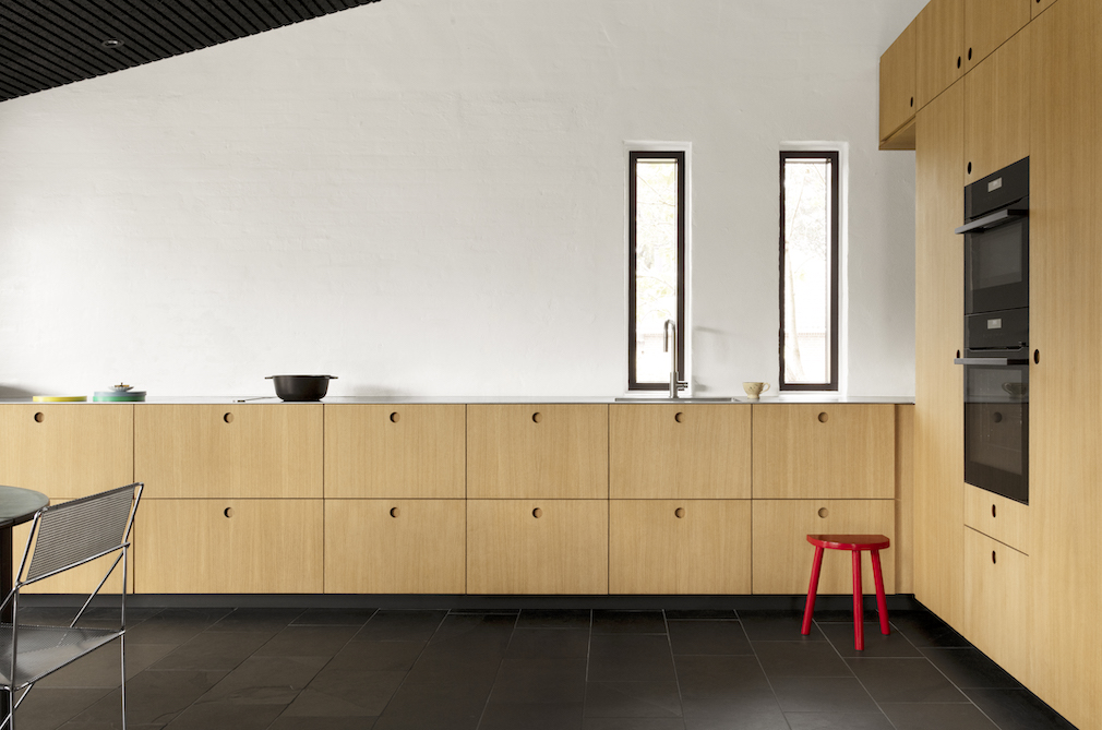 Envisioning a happy space for family meals, kids’ projects and joyful gatherings, Ann Mølgaard Andersen and Chung W. Cheung completely reimagined the kitchen in their late 1970s-era Mejdal, Denmark kitchen, eliminating a powder room and blowing out the high, pitched ceiling, which they clad with black acoustical tiles by Troldtekt. “It creates a cozy, cave-like feeling,” Andersen describes. White walls create a crisp backdrop for contemporary oak base cabinetry by Reform, metal countertops and dark slate flooring. Colorful accessories that can easily be swapped out for an entirely new vibe punctuate the neutral milieu. “It’s a clean, classy look,” Andersen comments. Photo courtesy of Reform