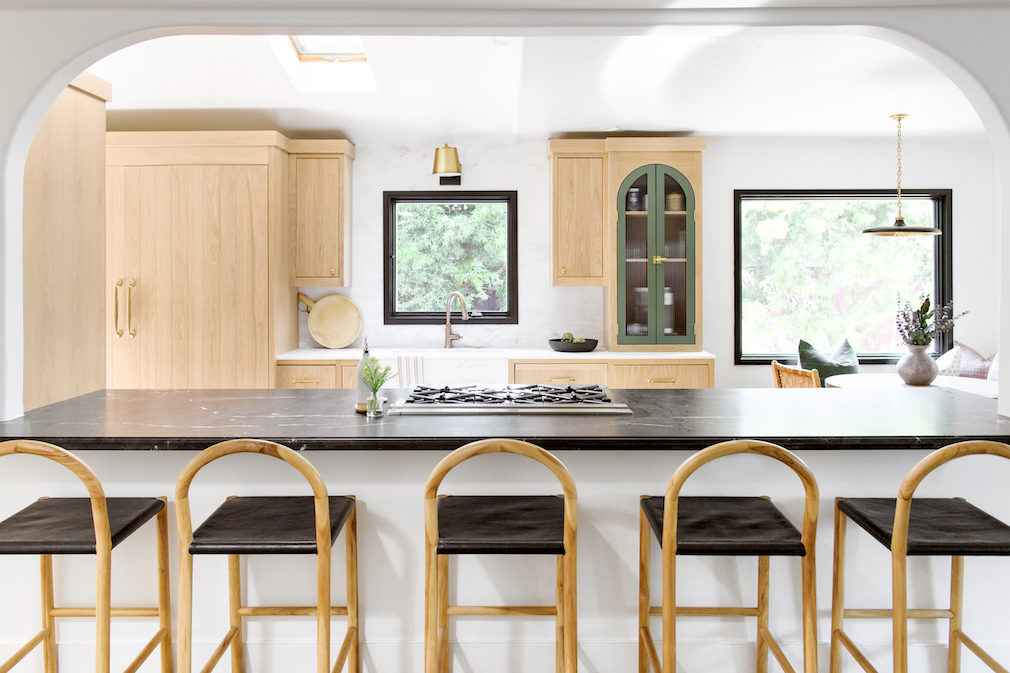 location just blocks from the beach in Cardiff by the Sea. A mix of white marble and black quartzite countertops buoy the restrained design while an arched cabinet door painted in a green hue with reeded glass adds an unexpected pop of color and visual texture. “This kitchen has a modern simplicity,” Wintersteen says. “The tones, textures and fabrics create a warm, comfortable and cohesive look that’s visually interesting but not too busy.”