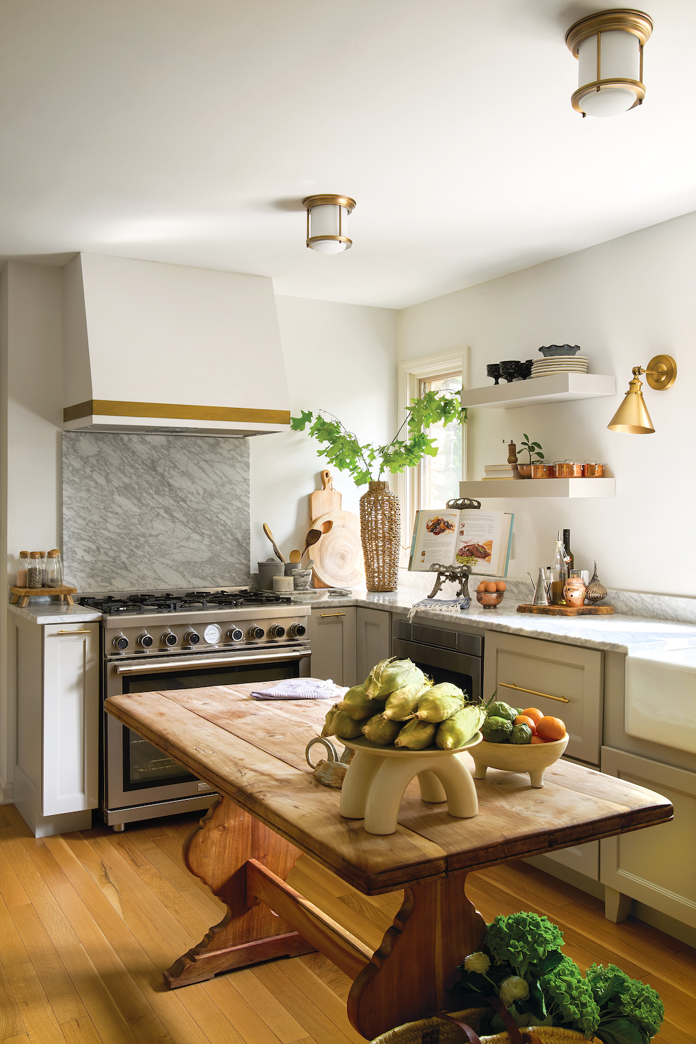 Drawing inspiration from her home’s stone exterior, interior designer Julie Paulino reimagined her Dublin, Ohio, kitchen with warm hardwood flooring and latte-colored cabinetry accented by Carrara marble countertops. “It’s a European-style kitchen with American functionality and technology, ” she remarks. The designer pushed back a wall, eliminated a peninsula and did away with upper cabinets on the window wall, resulting in a larger, light-filled space. In place of an island, Paulino incorporated a wooden dining table that invites long conversations. Photo by Marshall Evan