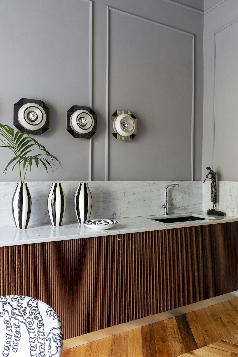 To create the convivial entertaining space his sister envisioned in her late-19th-century, Milan apartment, interior designer, Cosimo Bonciani relocated the kitchen to the brightest and most beautiful room in the house. “We wanted to build a space that could be experienced outside of mealtimes without feeling like a kitchen room,” Bonciani maintains, pointing to the lack of upper cabinets. Indeed, light-gray walls with classic moldings and oak flooring made from 100-year-old recovered planks foster a classic, comfortable backdrop for a bank of fluted wooden base cabinets with Carrara marble countertops. Sourced from a 1970s-era disco, a series of sculptural wall sconces take on the role of art. “We wanted to recall the golden age of Italian design,” he states. “This room became the centerpiece of the house.” Photo by Helenio Barbetta