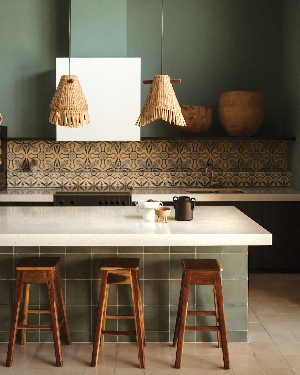Modernity and tradition commingle effortlessly in this Mérida kitchen. Located in a Colonial-era house, its boxy concrete hood and sleek quartz countertops juxtapose the handmade pasta tile cladding the floor, island and ornate, three-dimensional backsplash. In lieu of upper cabinets, a simple wooden shelf runs along the plaster-covered concrete range wall, displaying woven baskets the Dutch owners collected while living in Mozambique. They play well with the island pendants, which are made of a natural fiber harvested from the shores of a lake in Michoacán. “It was important for the design to reflect the home’s history,” explains architect Francisco Bernés. Photo by Fabian Martinez, Styled by Tami Christiansen