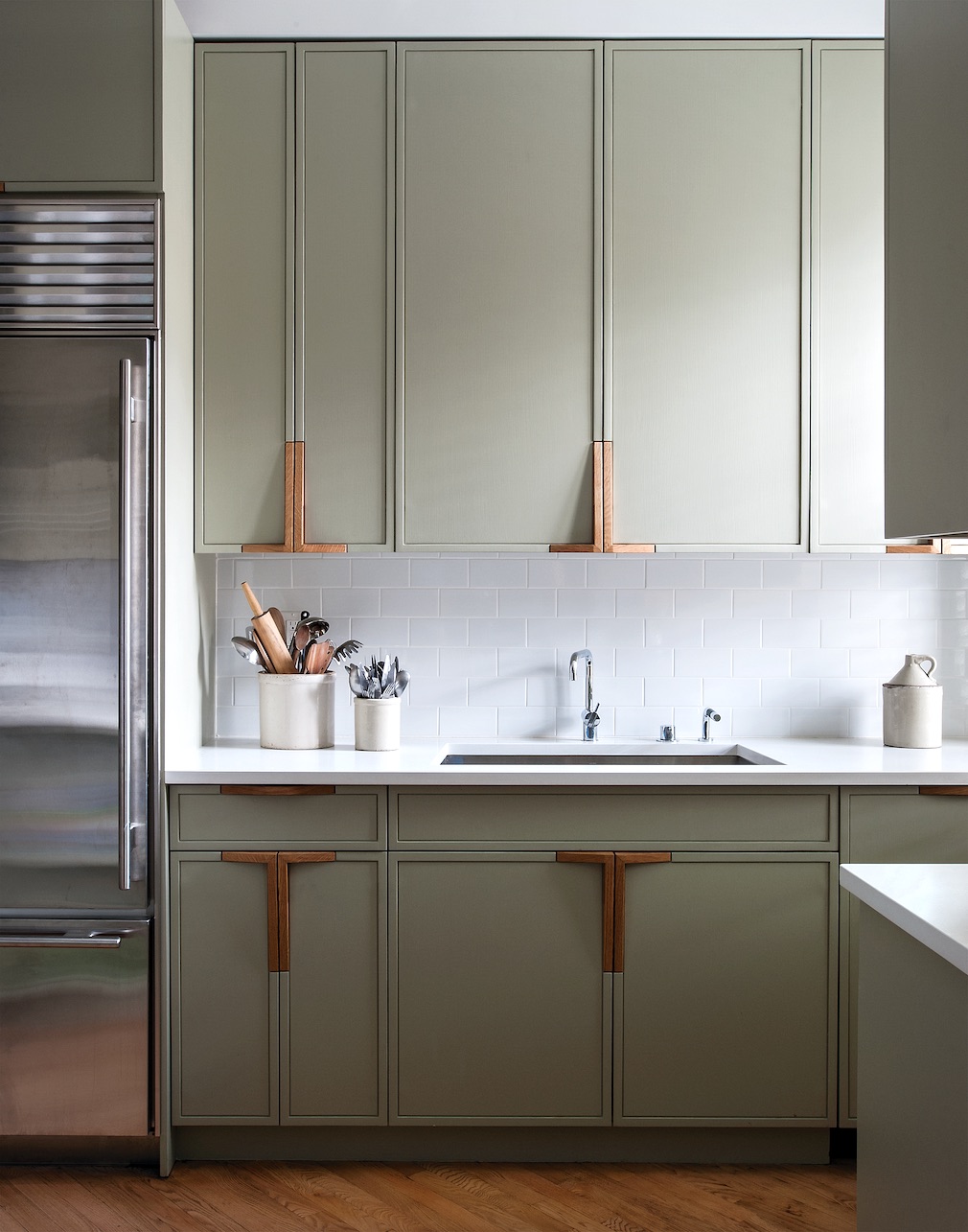 Rather than replace the updated cabinetry in their client’s Park Slope kitchen, interior designer Stefanie Brechbuehler and her team swapped out the doors with new Shaker-style ones painted in the same soft gray color as the walls and millwork throughout the apartment. “We wanted to calm things down,” she explains, pointing to the sleek white quartz countertops and matching subway tile backsplash. Custom wooden hardware with a bespoke profile further buoys the upscale design. Photo by Matthew Williams