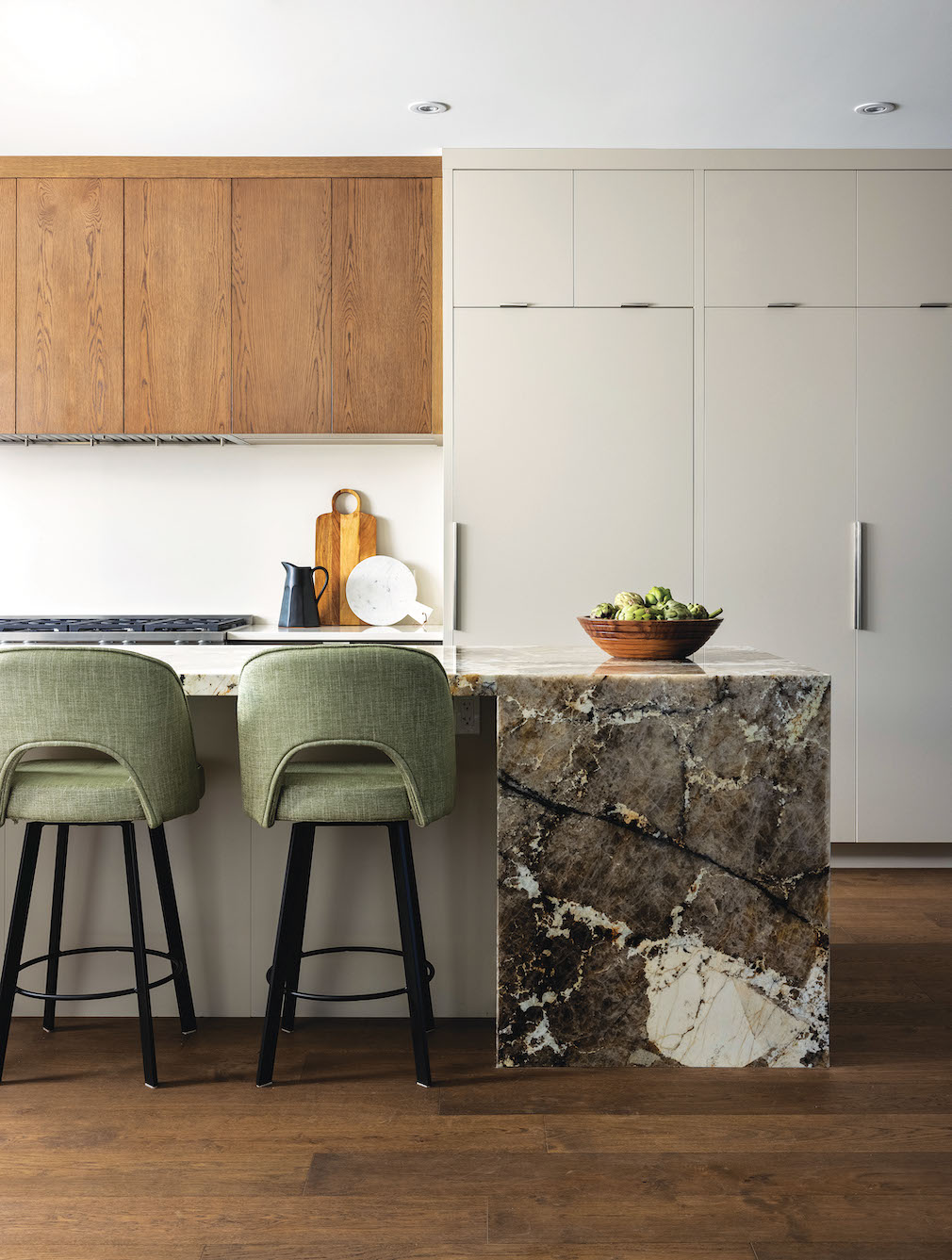 Veiny Patagonia granite countertops and a seamless white quartz backsplash play off the restrained mix of painted and oak cabinetry in this upscale Calgary kitchen by interior designer Alykhan Velji. “Natural stone makes an impact and adds a sense of timelessness,” Velji explains. Indeed, the island countertop waterfalls on both sides, adding a sense of drama. Integrated appliances, meanwhile, maintain the minimalist midcentury-inspired vibe the owner envisioned. Photo by Joel Klassen Photography