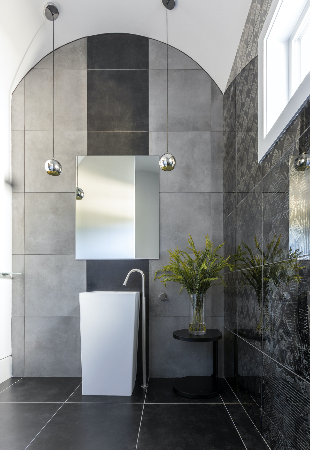 This powder room got a glam uplift with a wall of mirrored patterned glass tile cornering a concrete-like grey one.