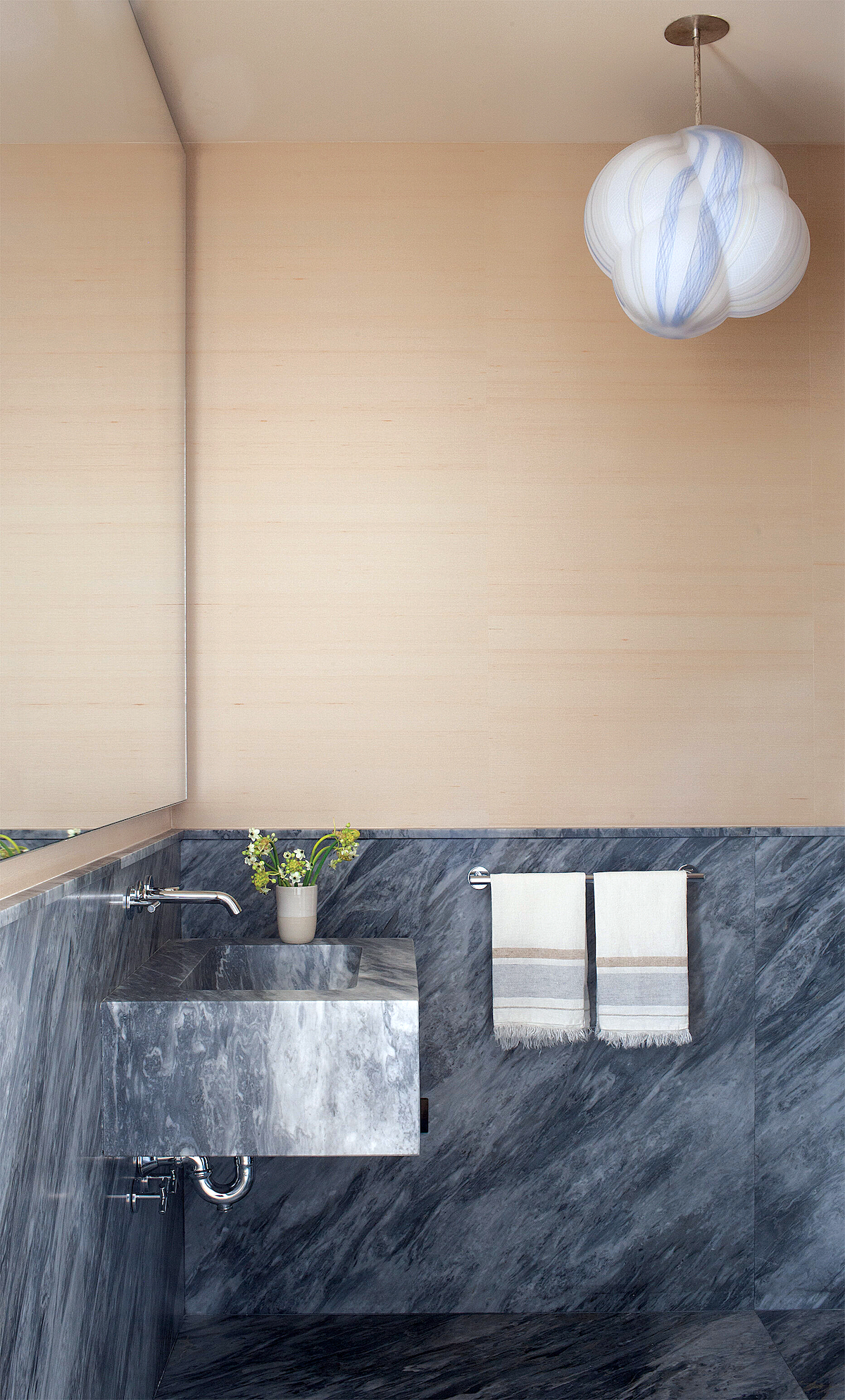 Paired with an elegant, handblown pendant light in a cloud-like shape, a woven silk wallcovering softens the weighty stone sink in this sophisticated powder room. “New York can be hard and difficult, and I wanted to create a calm space for [the homeowners],” says designer Larysa Sendich.