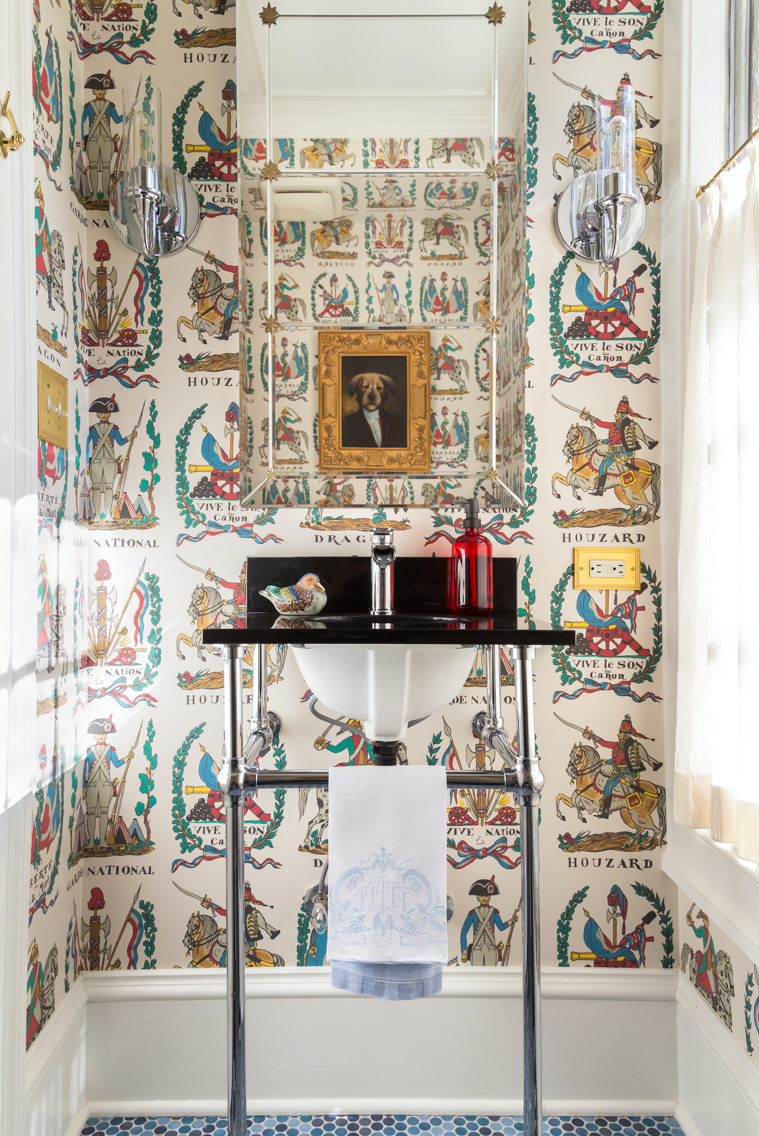 “The client had found a hilarious painting of a dog in colonial dress, and we thought the powder room would be the perfect spot for it!” shares Annie Elliott of this fun space. “We chose a whimsical wallpaper from Brunschwig & Fils – Battle of Valmy – and continued the lighthearted spirit with blue penny tile on the floor. A sheer curtain provides privacy while allowing light to flood the tiny space, and the petite console sink is the perfect scale.” Floor tiles: Waterworks | Curtain fabric: Romo | Painting: from a vintage shop in Bethesda, Maryland