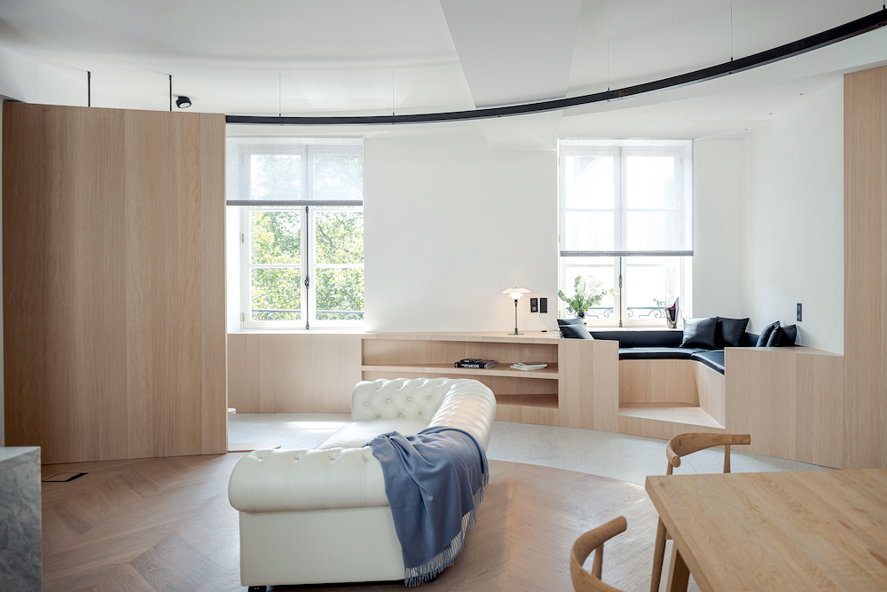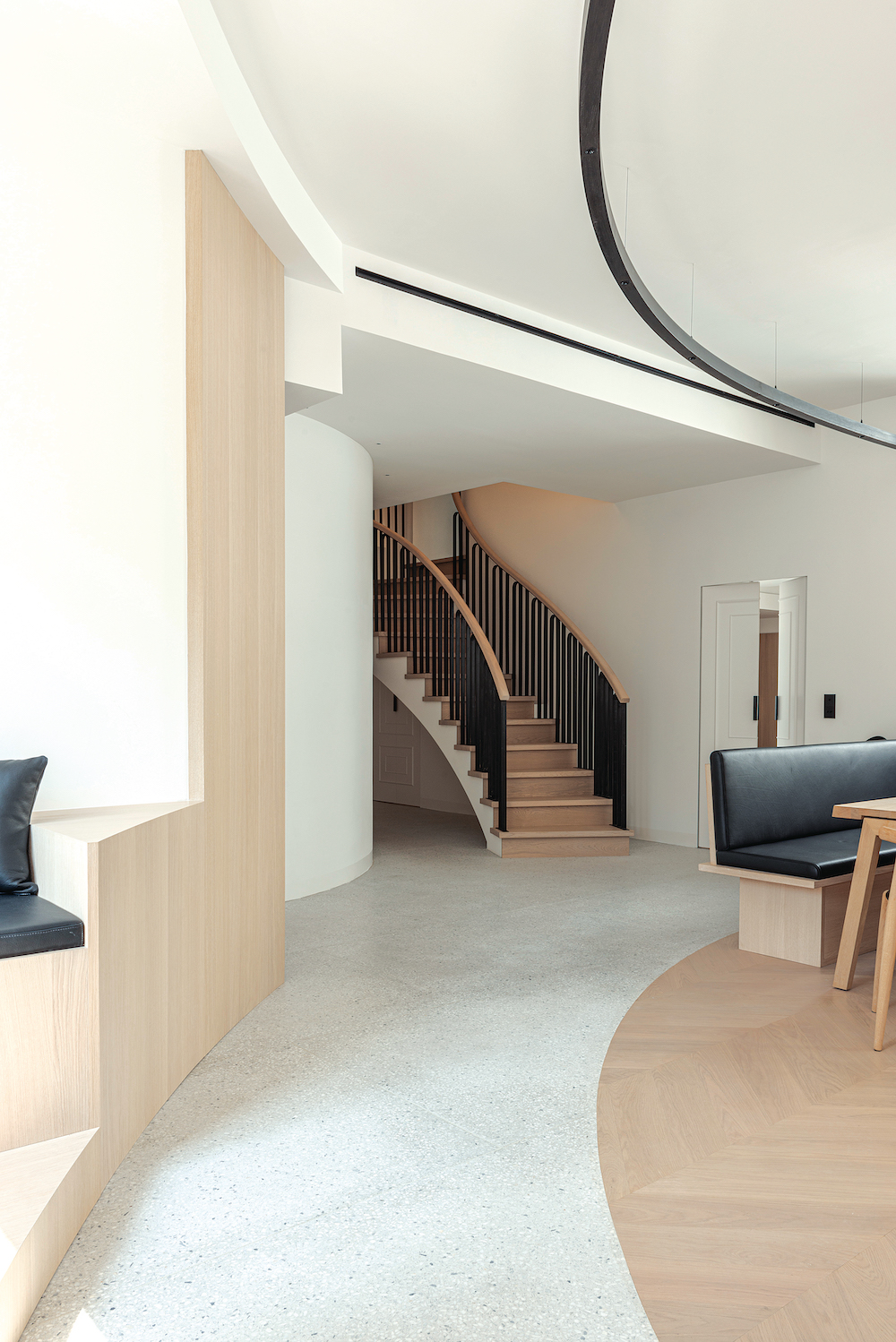 The nautilus pattern becomes an architectural element throughout the apartment. From the bleached oak floors that are set in a french herringbone pattern to the oak staircase with a double curvature, the living spaces unfold naturally.
