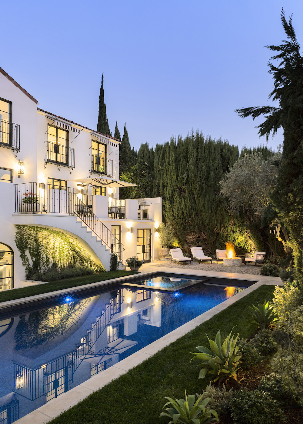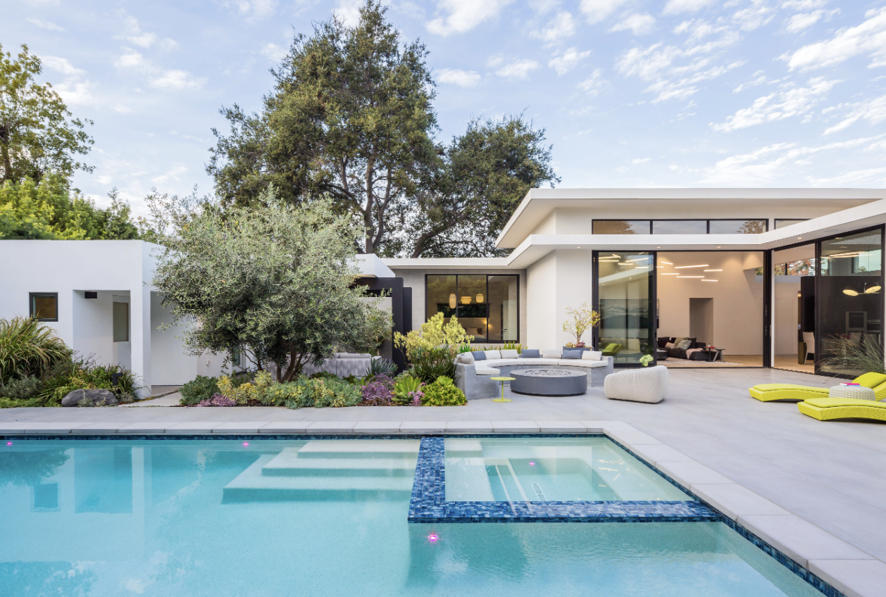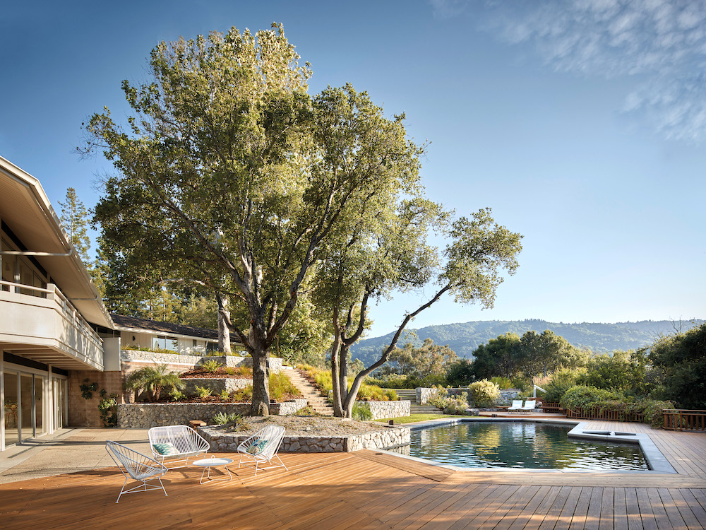 Lisa Meier preserved as much of this Southern California house as possible—all the patio planks were sanded down and a fresh finish was applied to give them new life.The pool’s concrete was replaced with a black pebble surface that gives the water an alluring appeal. While the outskirts essentially remain the same, the designer cut down trees that impeded the gorgeous vistas of the surrounding landscape—replacing them with prairie, salvia, and lavender plants that don’t require a lot of water. Photography by Sabrina Rothe.