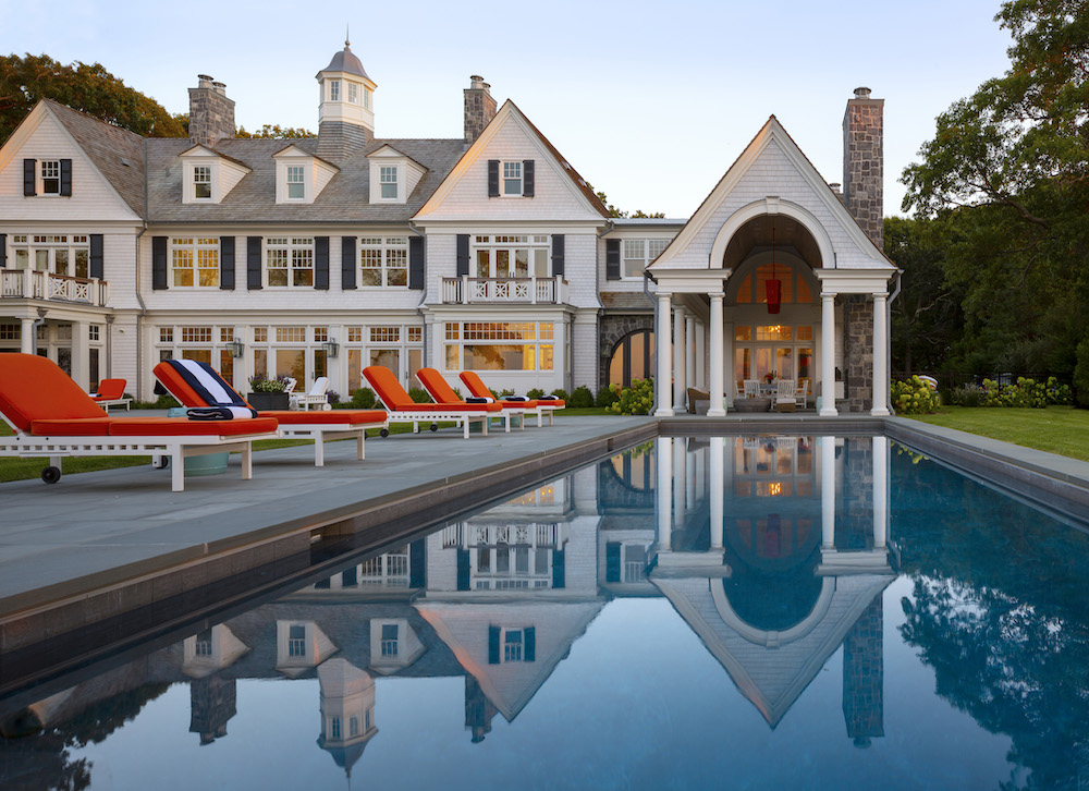 At the rear of this weekend getaway overlooking the Long Island Sound, a large arch frames a vista from the den through a Palladian loggia sheltering outdoor living spaces, and out over the pool and to the open waters beyond. Photography by Durston Saylor.