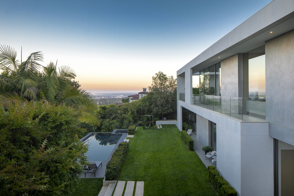 Outdoor spaces — and views toward them — are central to this home. The pool is set amid a verdant lawn. “Past the foyer, large glass openings provide city and ocean views,” describes XTEN president, Monika Haefelfinger. “The façade along the garden side of the house features large glass sliders on two levels, providing for a beautiful vista of the garden and the Pacific Ocean.” Photography by Art Gray.