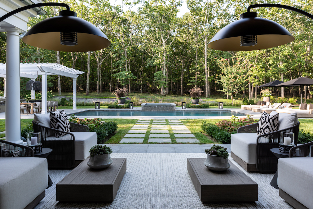 With the client’s love of entertaining in mind, Downey designed this exterior’s spatial programming with a delicate balance of soft taupes and sand tones, exuding a sense of warmth throughout the space with contrasting dark blacks, grays, and iron finishes. Inspired by the property’s natural surroundings and the client’s affinity for beautiful, sculptural furnishings and objects, Downey incorporated thoughtful materials such as raw teak, limestone, and linen for their modeled, tailored, and earthy qualities. Photography by Alan Tansey.
