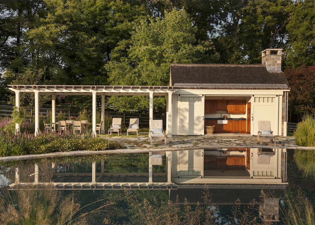 Though modest in size, this pool house, with its exterior beadboard cladding and hand-split cedar roof shakes, echoes the early American sensibility of the other 18th- and 19th century buildings on the property, while the organic shape of the pool blends in with the landscape, which includes regional plantings, rolling fields, and a nearby pond. Photography by Durston Saylor.