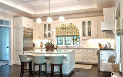 The previously tiled two-story entry foyer got a new patterned floor and paneling for an architectural touch; and the kitchen was opened up with a new island, and walls taken down to allow for easy mingling and family gatherings. “Having young grandchildren, they wanted them to be able to play in the home, and make it really user-friendly and multifunctional,” explains Hillery. The streamlined layout also ensured seamless views of the river from every room. “The whole idea was to keep it really clean and simple. You walk in the door and you can see all the way out to the water, which you couldn’t do before.”