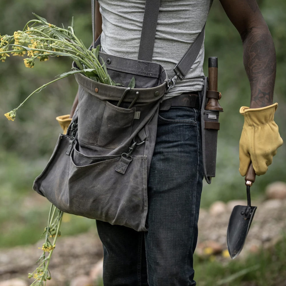 Inspired by a traditional Japanese gardening knife, this expertly crafted essential has a double-edged stainless steel blade, a flat pommel base that doubles as a hammer, a hook blade that can be used as a twine cutter or bottle opener, handy inch markings, and it comes with a protective waxed canvas sheath.