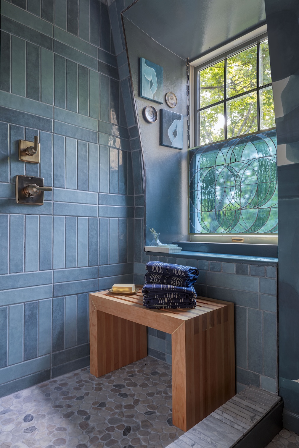 Sources: Geometrie wallpaper; Palmer Works custom cherry vanity; Peconic Kitchen & Bath stone material and fabrication; Benjamin Moore paint; Robert E. Otto Glass, Inc. vanity mirror; Bespoke Glass custom stained glass window cover; Nicole Jurain pottery; Autumn Sonata towels; Mayer & Ko custom wood shower bench; Lauren Cunneen Art acrylic paintings; Modern Matter robe hooks, soap dish and toilet paper holder; MSI Surfaces tile.