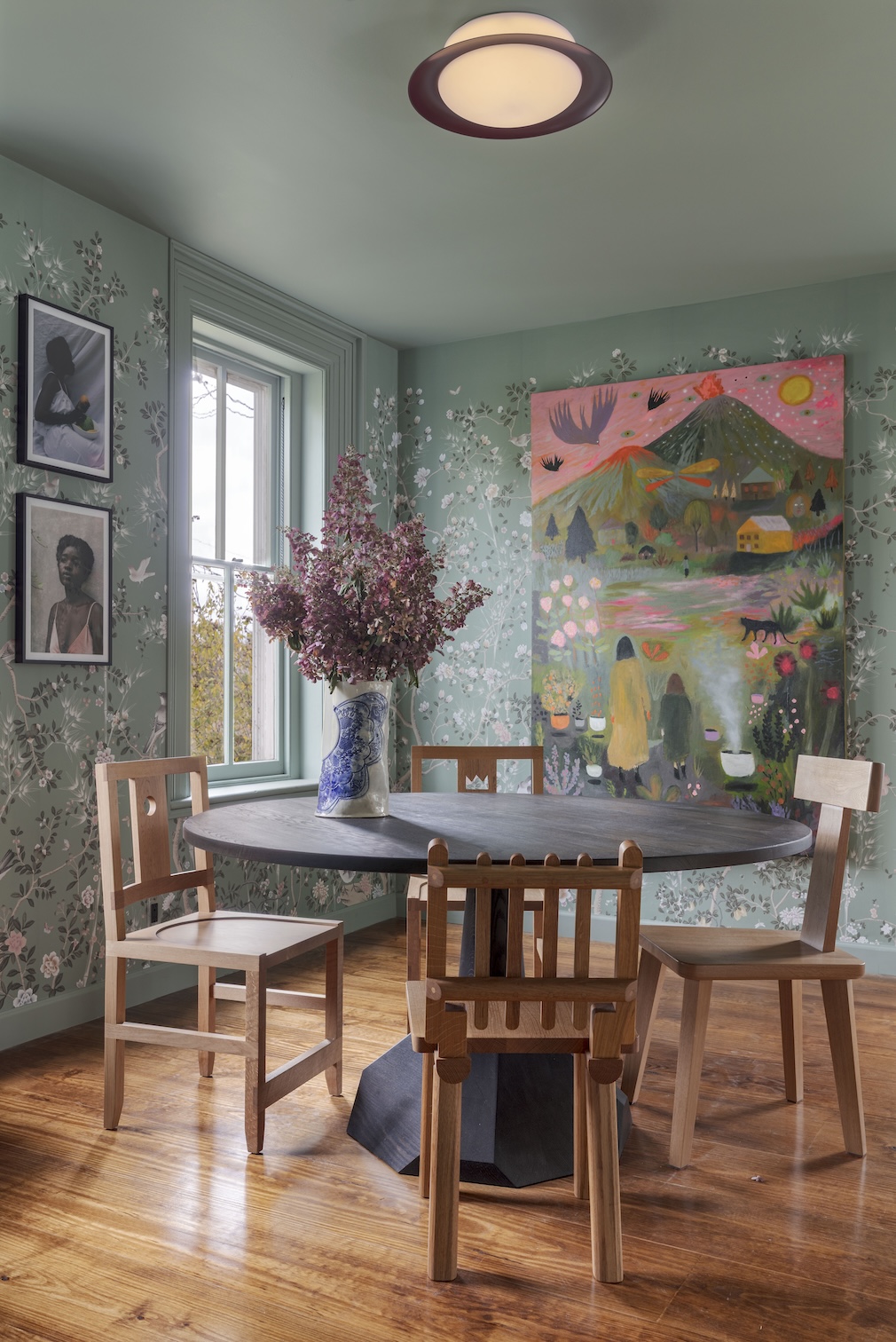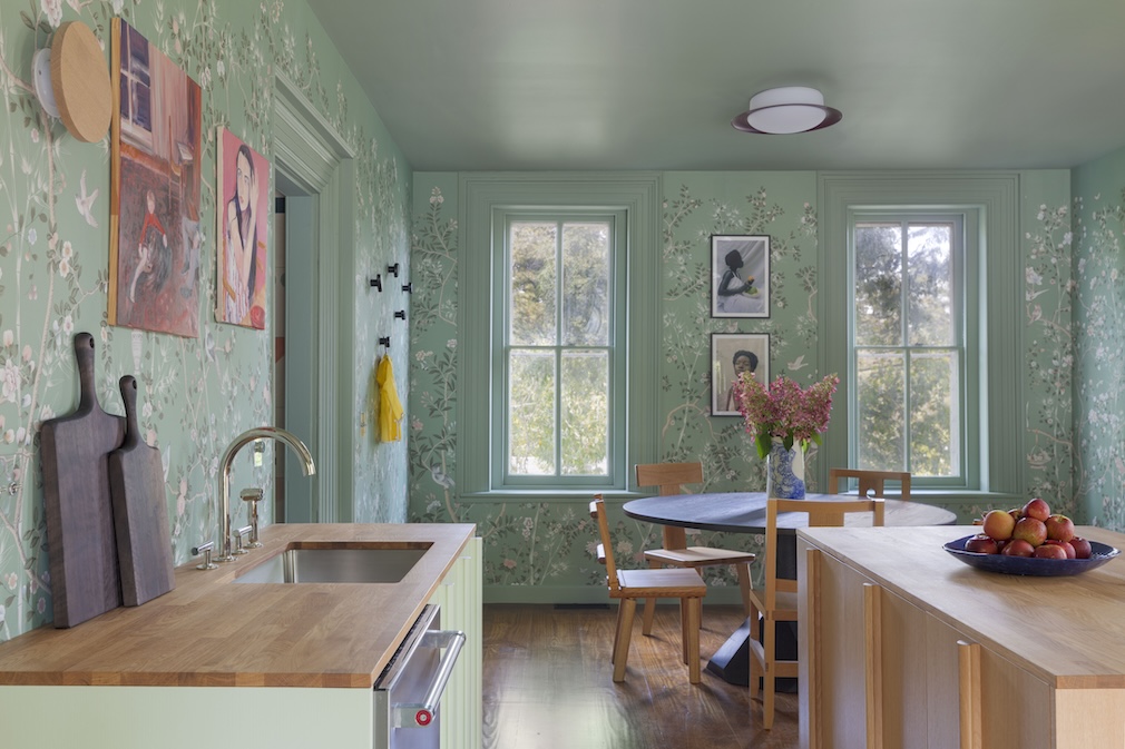 Sources: Fromental wallpaper in Millefleurs; Stone Ridge woodworker Andrew Finnegan handcrafted dining table, bench and stool; Reform Cabinets Column collection; RBW ceiling lights and sconces; Corston clear switch plates; Pinkwater Gallery small artwork; Michael McGrath large-scale artwork; JRN Pottery vases; Dean Babin wood accessories.