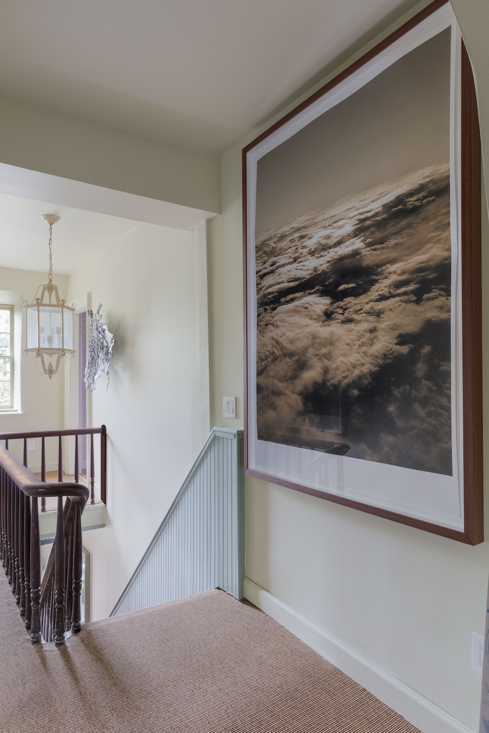 Sources: Benjamin Moore paint in Spa (walls and ceiling) and Stratton Blue (staircase); Rosendale Flooring Co. carpet; Andreas Gatterer Photography cloud photo print; Marieken Cochius metal sculpture and welded drawing; lighting is original.