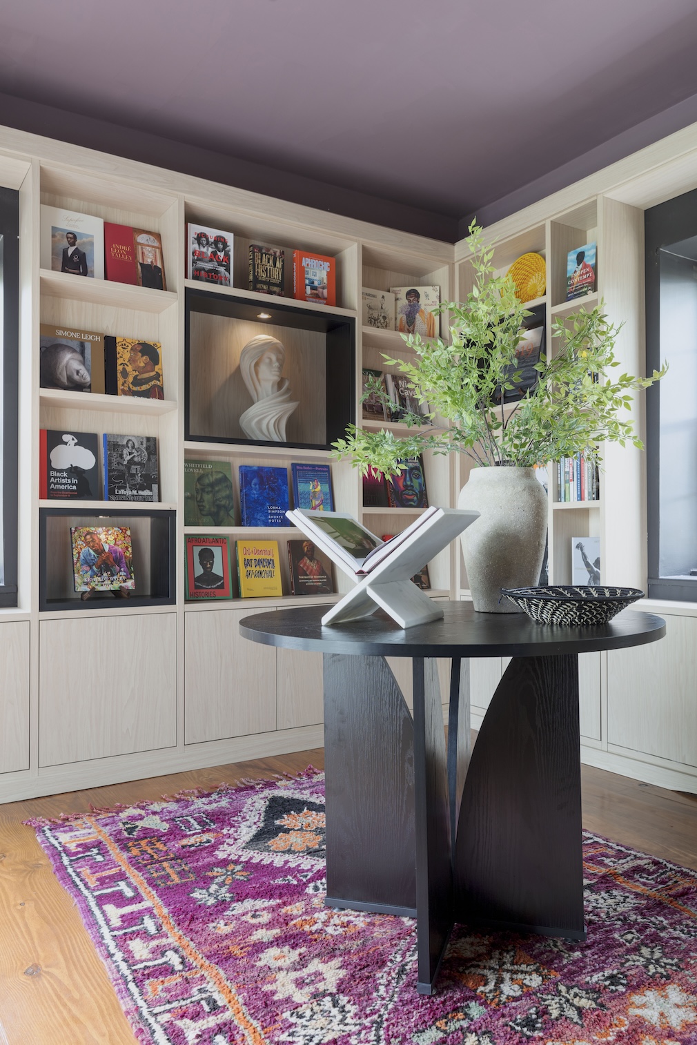 From the Designers: We created the To Be Free Library, a design inspired by Black liberationists and one woman in particular: Sojourner Truth. Truth was enslaved just minutes from where this year’s home stands. We researched and read about this American hero and wanted to create a space that honored what she so boldly knew: that one may be denied liberty, but we are all free. The outdoor garden room became a wonderful companion space. We were inspired by reflective gardens and seating areas, like one would experience at the National Museum of African American History and Culture in Washington, DC. We wanted it to be a space where people could look out into the water, reflect on the history around them, sit with others, and be at peace.