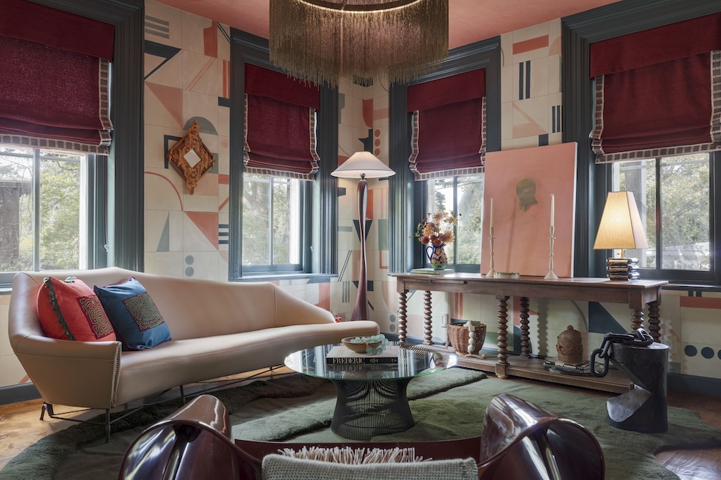 Sources: Benjamin Moore paint, Porter Teleo wallpaper, Jensin Okunishi Studio rug, Arteriors Home chandelier, Fenestella NY and The Gallery at 200 Lex vintage sofa, Casa Marcelo Home pillows, Craig Anthony Longhurst ribbon chair/ coffee table/floor lamp, Cody Brgant stools, Ian Ingersoll bar, Montage Antiques console, Peter Cusack Studio painting, Cottage and Campe nook console, Lakeville Interiors window treatments, Revolution Fabrics window fabric, Schumacher window edging tape, Ani the Artist carved mirror, Nicole Jurain Pottery vase, Fox Object styling, The McKenzie Shoppe select décor, Upscale Movers USA moving.