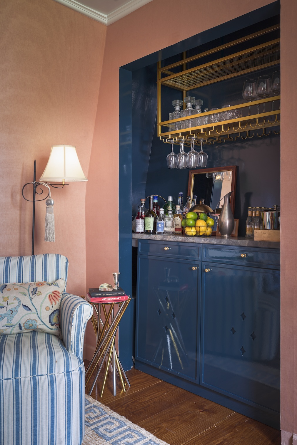 Sources: Sawkille Co. painted chair; Dedar Milano Moiré Chanvre 009 wallpaper; L.A. Painting lacquer painting; SP Woodenworks custom bar; Burke & Pryde couture pigeons and medieval shell plant pots; Benjamin Moore paint in Outer Banks; Caliber Granite blue fusion quartzite bar counter.
