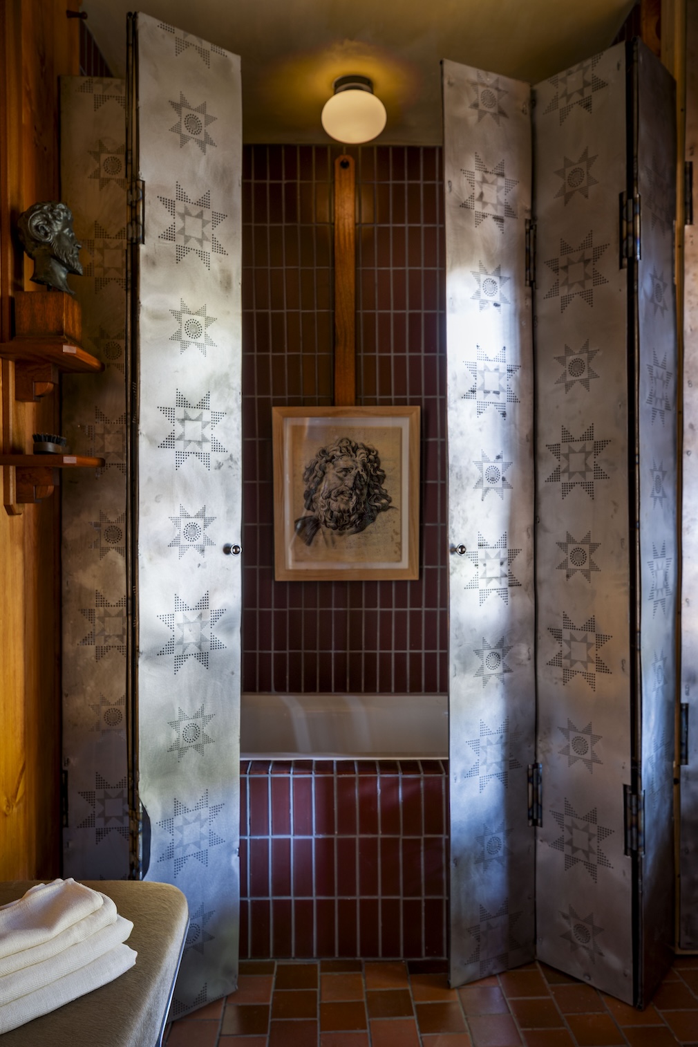 From the Designer: I envisioned the Primary Bath as a space of emotional retreat, a room that feels both grounded in craft and slightly untethered from time. Rather than a “spa” in the traditional sense, I wanted it to feel like a historical daydream: part Shaker restraint, part surreal fantasy. A place where the act of bathing becomes a quiet ritual. Warm wood, tactile surfaces, and imperfect materials were chosen to cultivate an atmosphere that’s intimate, romantic and softly mysterious.
