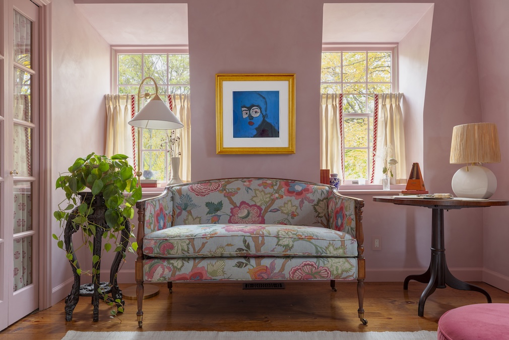 Sources: Benjamin Moore trim paint in Kept Love Letters; Sydney Harbour Paint Company wall and ceiling lime wash in English Rose; Artist Painting Company decorative wall painting/lime wash application; Revolution Performance Fabrics window treatments; Modern Matter closet hardware; Hudson Valley Lighting Group lighting; MC Home antique plant stand; Mark Nelson Designs area rug; Vanity Sloth Avarice Antiques music stand and sheet music; Mack Sikora sculpture; Jenny Kemp acrylic paintings; Fair side table.