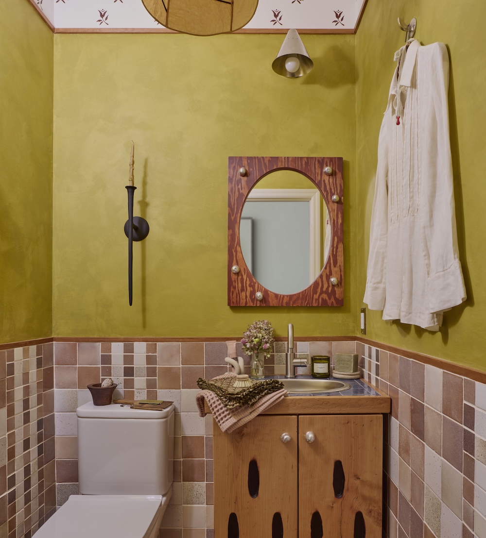 Sources: MI & GEI bath hardware; SIN accessories; Palmer Works vanity; Demetria Chappo art; Sydney Harbour Paint Co limewash.; Artist Painting Group limewash and stencil painting services; Katie Ford mirror; Findere pendant light; Elana Shvalbe vase; Dean Babin stool; Vanity Sloth Avarice Antiques sheepskin rug and botanical book; Benjamin Moore door trim in Pebble Rock and stencil paint in Bewitched; OUTERclé tile.