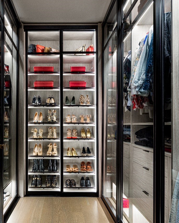 Just because a closet is one of the more private areas of the home doesn’t mean it can’t be stylish. In fact, Ogle argues that it can seamlessly fit into the rest of your space. “I really try to start from the overall style in a client’s home,” he shares. “Is it modern? Is it transitional? Is it traditional? I work backwards from there [because] the functionality of it is always gonna remain the same. We can swap the style from Shaker cabinets to flat faces and illuminate all of those spaces accordingly.” Ogle looks to Element’s back-painted glass and mirrors for a glam effect, while leather-wrapped shelves and countertops can usher in a more refined look.