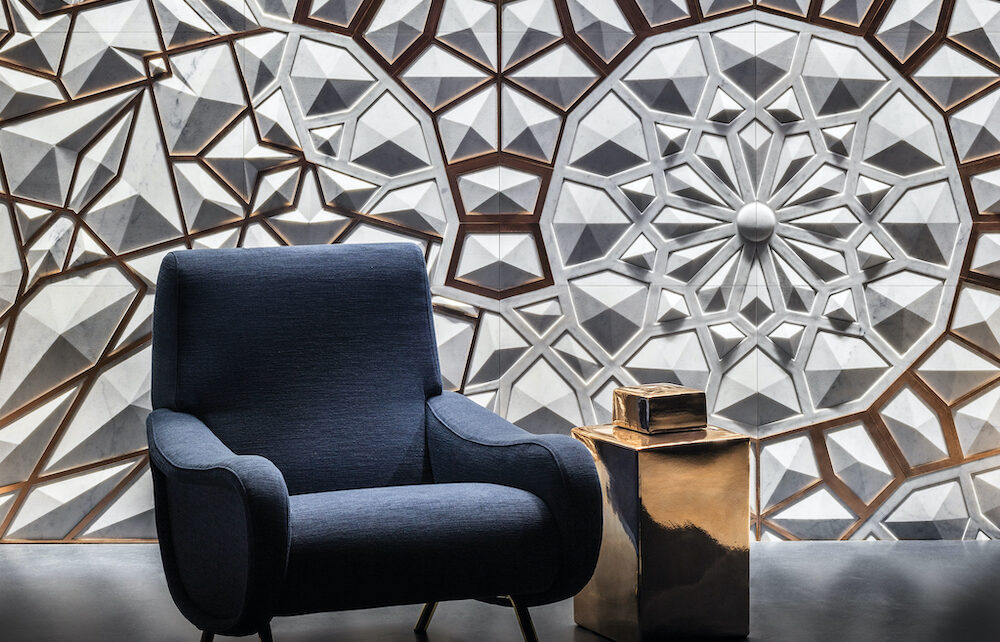 In this three-dimensional decorative wall panel, geometric arabesques crafted of white Carrara marble are layered and overlapped to create a dynamic kaleidoscopic pattern. Named Monreale, the design conjures up the idea of the blending of Arab and European cultures in the historic town. Designed by Elena Salmistraro for Lithea (2018).