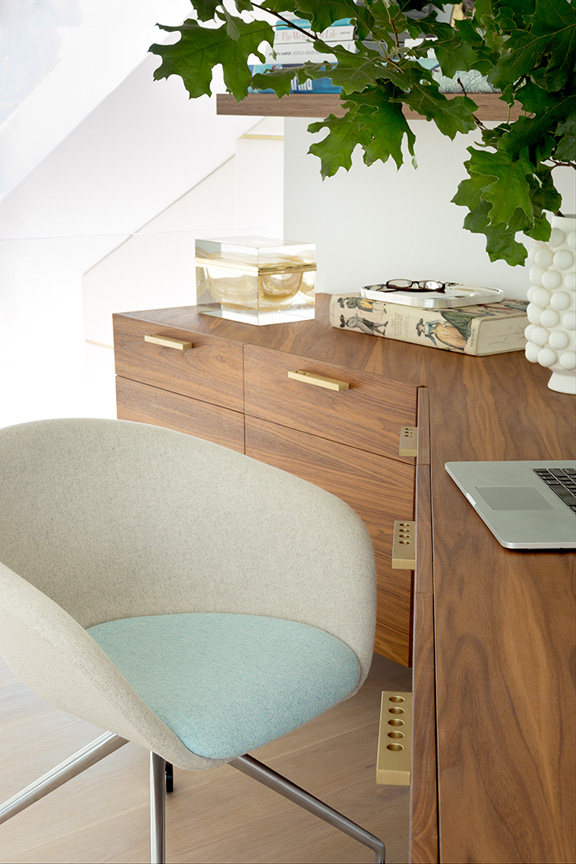 Employ light and calming colors designed to relax the mind and body—workstations should help you concentrate and not distract from the task at hand. While we love dark and moody rooms, they tend to inspire a relaxed atmosphere more suited to bedtime rituals or a cozy night in. The same goes for patterns. While we don’t agree with having to nix them altogether—if you are going to use a wallcovering, make sure the pattern is not overwhelming. You can always soften the effect of a focal wall with neutral accents and soft textiles.
