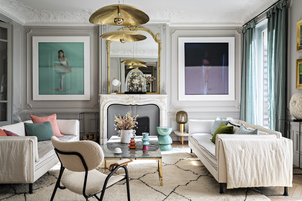 Sofa by Caravane • Carpet bargain-hunted in Morocco • Coffee Table from architecture studio Bateaumagne • Suspension Lighting Paola Navone • Armchair (Italy, 1970) bargain-hunted at Thomas Bonhommes, Puces de Saint-Ouen • Linen Curtains by Harmony Textile • Stool by India Mahdavi • Oil Paintings by Etienne Assénat • Glass Globe on mantel from Puces de Saint-Ouen • Cushions by La Maison de Vacances • Photo by Yann Deret.