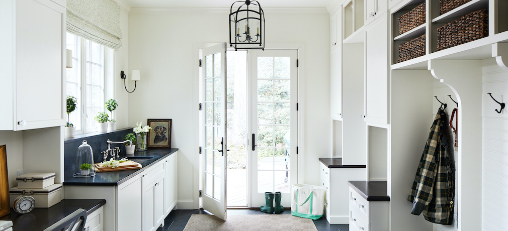 DESIGNER: Marika Meyer, Marika Meyer Interiors PROJECT LOCATION: McLean, VA DESIGN DETAILS: This mudroom was formerly the dining room. The clients rarely used the space and needed functional solutions for storage, laundry and the family dogs. They wanted an area for gardening and potting, as well as a family office. We were lucky to have so much beautiful natural light and tall ceilings, which helps keep the space from feeling crowded. We wanted it to be light and bright, and to be a continuation of the materials on the exterior.