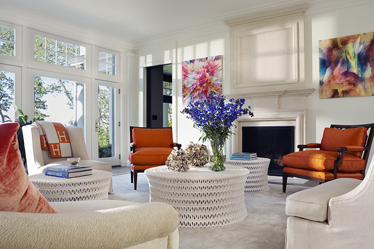 Fenstermacher: “I use an intense orange often, because in the right setting there is no such thing as too bright. I work with both bold and soft colors depending on the room, and I usually feel that a dark color in a small space is more interesting. Adding pops of color can change a neutral scheme – as in this sun-drenched room – quickly and easily.”
