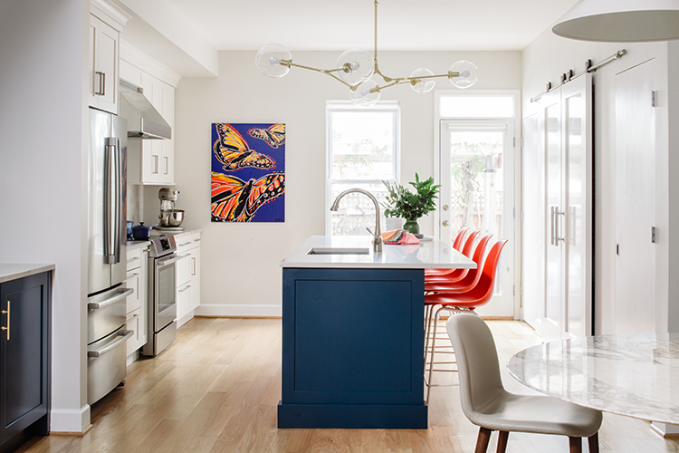 “The clients have two young boys and they really wanted some color, as well as a kitchen that felt fresh, modern and a little playful. We like contrast, even when it’s more tone-on-tone; we want spaces to feel crisp and well defined. We’ve designed lots of spaces with navy, and in this project, the blue is brighter and a little punchier (Deep Aegean by Wood-Mode). Another way to add color is in appliances. Sometimes folks are looking for a statement piece and a colorful range can provide an opportunity to bring color into the kitchen. Punches of color are best done in furniture, lighting, tile, decorative accessories and artwork.”
