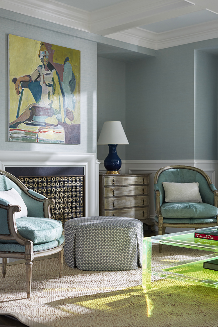 “This room is a great example of how we like to layer color through various mediums like furnishings, paint, textures and art. We wanted to mix old and new, referencing the past but also showing a curiosity for the future. There’s a way to do this without going completely modern or all traditional. For example, the traditional profile of the bergère chairs is made edgier with the brightly colored hair-on-hide upholstery. We helped the client purchase this art piece for her previous home, and it worked with the design we envisioned for her new space. Because of the client’s love of blue and green, we referred to Madeleine Castaing’s historic use of those colors but turned up the volume to 11 to make it more current and fresh, and incorporated traditional elements with a youthful twist for this fashion-forward client.”
