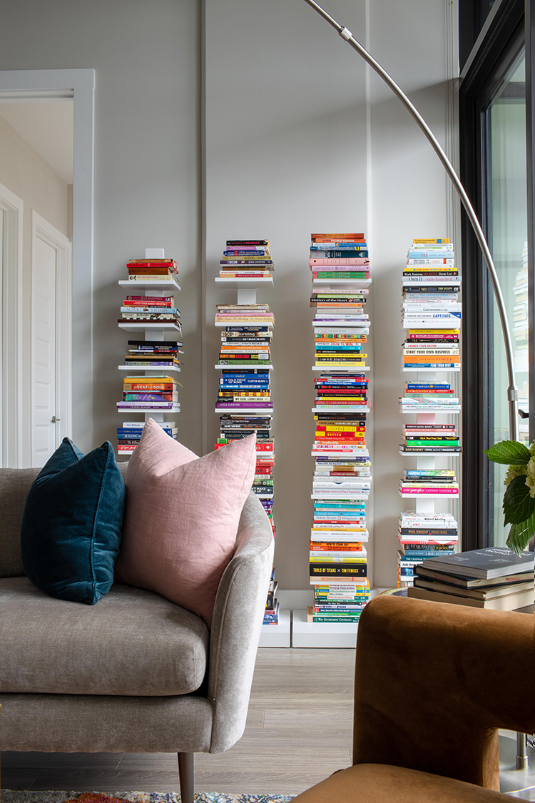 “This room is a good example of having a neutral base with finishes layered with fun color pops throughout the space. My client has a large book collection (categorized by topic). We found these cool spine bookshelves for a non-traditional way to display them. We could not have been happier with all the color the books provided on this wall. If a client is willing to push the envelope a little with wall color, I suggest checking out the lighter colors at the top of the paint fan deck charts. Select a color that works with the overall scheme in a soft wash of color that can almost become a neutral. Artwork and textiles as wall display also provide color with less of a commitment. These might be the gateway for a client to get comfortable and explore more color. I love how color can stimulate a mood or spark a feeling. We can always find ways to use those brights without having to sit in a room with sunglasses! More subtle uses of the bright colors can be with art and accent furnishings, or even with trim. My preference is to use the bold and bright wall colors in spaces with defined rooms versus open floor plans.”