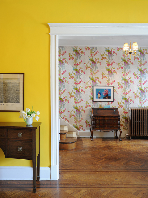 “Our living room is tricky. It’s north facing with only one gigantic window, so the light is limited. We’ve painted our living room many times: it has been two shades of dark blue-gray, an intense red, white, light yellow and pale pink, to name a few. We are delighted with this egg-yolk yellow – it’s fun and cheerful, and it stands up to the gloom! Thomas Jefferson had a dining room this color. Because the yellow is so intense, it was important for the wallpaper in the foyer to have a white background to give your eye a break from the saturated color. This wallpaper (Paradiso by Nina Campbell) has a lot of color – teal, chartreuse and purple peacocks! But they’re set against a field of cool white with a light gray trellis pattern. Interestingly, there’s no actual yellow in the wallpaper, but that’s one of the reasons it works so well. The colors coordinate without being overtly matchy.”