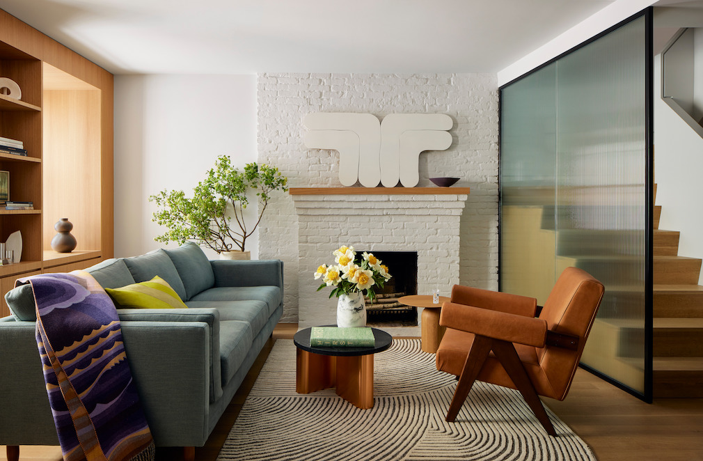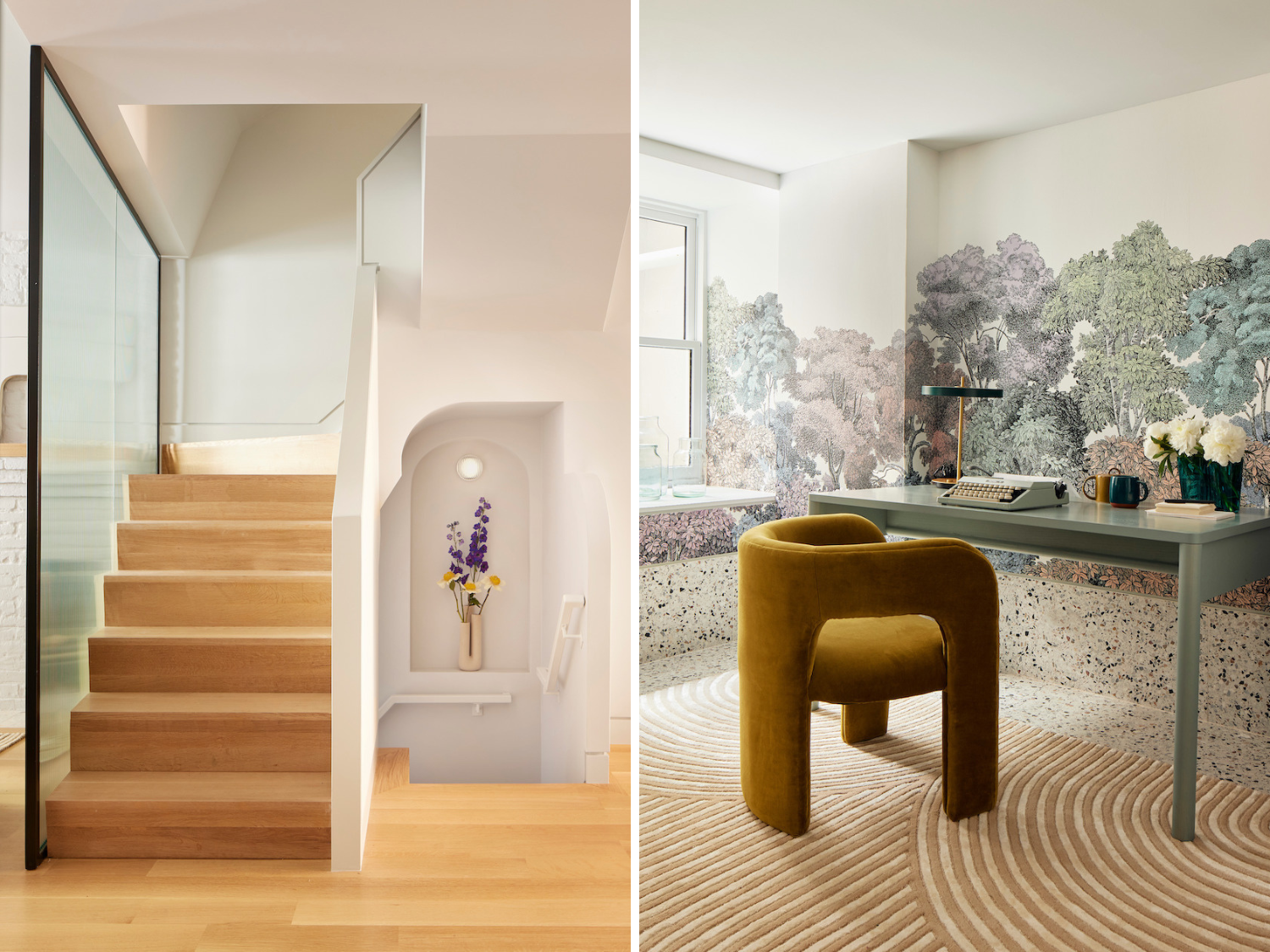 The reeded glass wall conceals the front stair, which leads down to a work-from-home space on the lower level. There, mural wallpaper depicting a tree canopy envelops the room.
