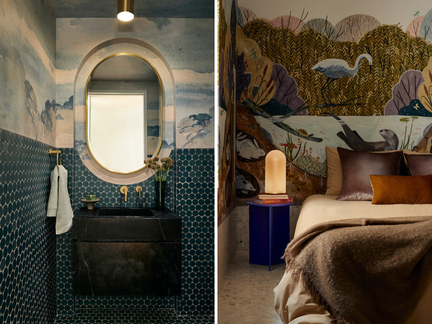 Throughout the home, smaller spaces boast bold colors and wallcoverings. A wallpapered powder room features a seaside scene, a custom soapstone vanity, and blue-green penny tiles. While the rear guest bedroom is lined in a mural wallpaper with a playful woodland scene.